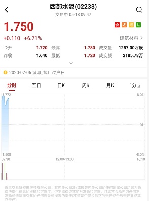 智通财经APP获悉,受政策利好刺激,水泥股早盘全线走高,西部水泥(02233)盘中表现突出,截至9时47分,涨6.71%,报价1.75港元,成交额2185.78万。