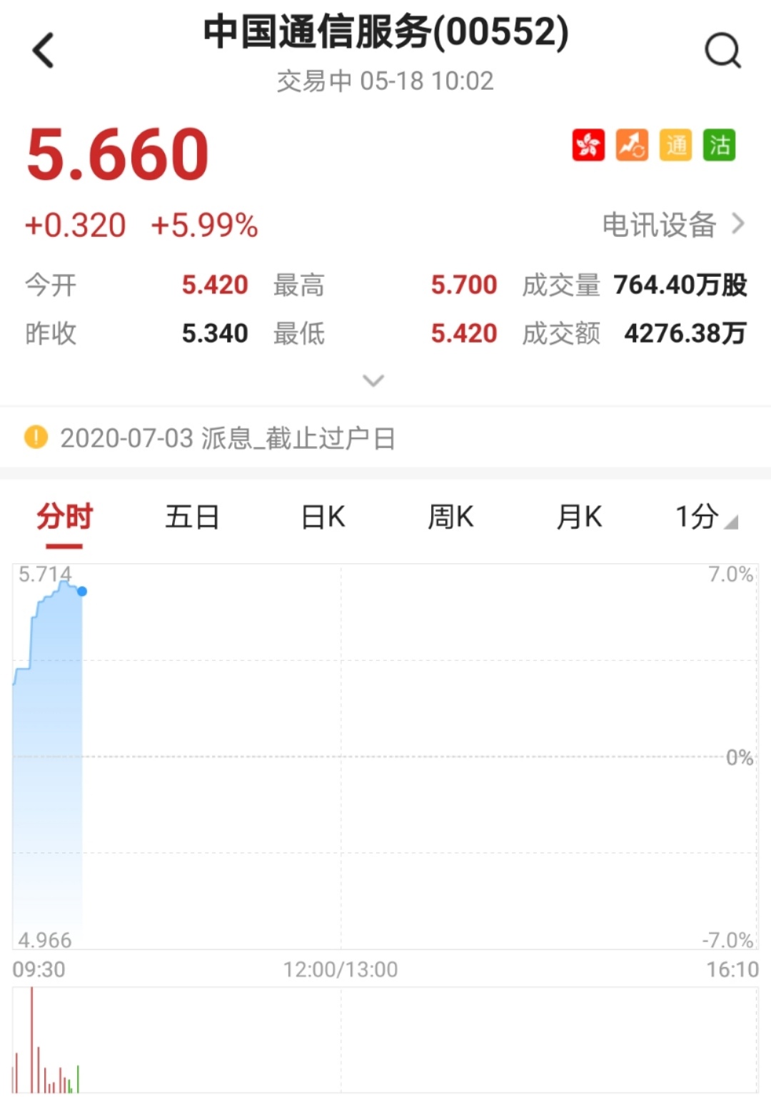 智通财经APP获悉,中国通信服务(00552)早盘涨超6%,突破多条均线。截至10时02分,涨5.99%,报价5.66港元,成交额4276.38万。