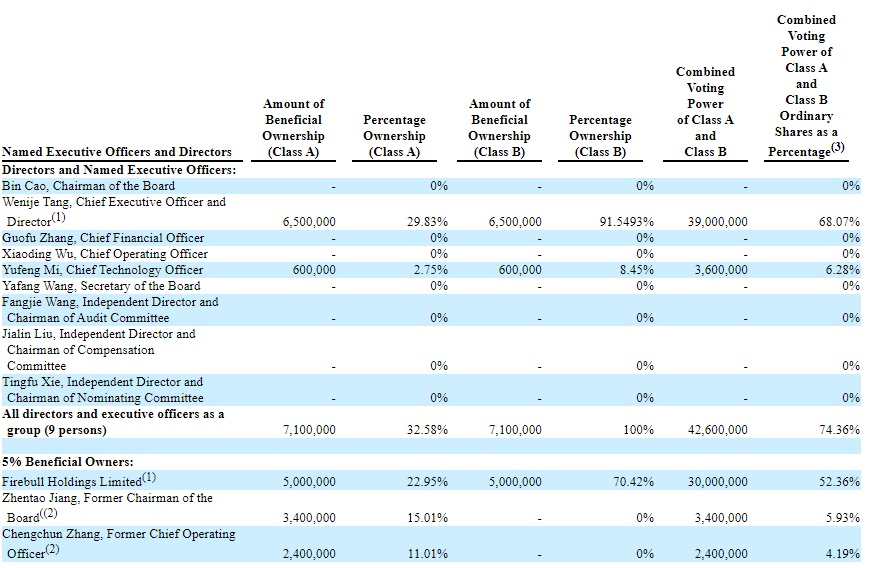 公司CEO汤文杰个人分别持有1,500,000股A类普通股和1,500,000股B类普通股。此外,汤文杰和该公司董事长 Cao Bin共同间接持有Firebull Holdings Limited实益拥有的5,000,000股A类普通股和5,000,000股B类普通股。汤文件拥有这家公司所持有股票的表决权和处置权。综合来看,汤文杰拥有安高盟68.7%的投票权。Firebull拥有的5,000,000股A类普通股的股息权利保留给该公司的员工,以帮助公司留住人才。