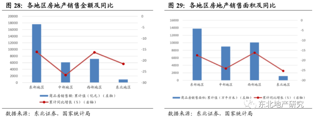 分区域来看,东部、中部、西部和东北区域房地产开发投资完成额分别为18444、6418、7342、900亿元,分别同比变化-3.1%、-10.6%、+3.7%、-1.6%,环比均有所收窄,环比分别收窄3.0、8.1、4.5、12.4个百分点,西部区域实现年内首次增速有负转正,其明显拉动作用。