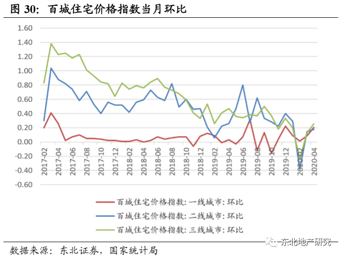 2020年4月,百城住宅价格指数同比上升2.93%,涨幅收窄0.02个百分比,房价得到了良好的控制;其中一线、二线、三线城市住宅价格指数分别同比上升0.87%、3.69%、3.21%,总体保持稳定。