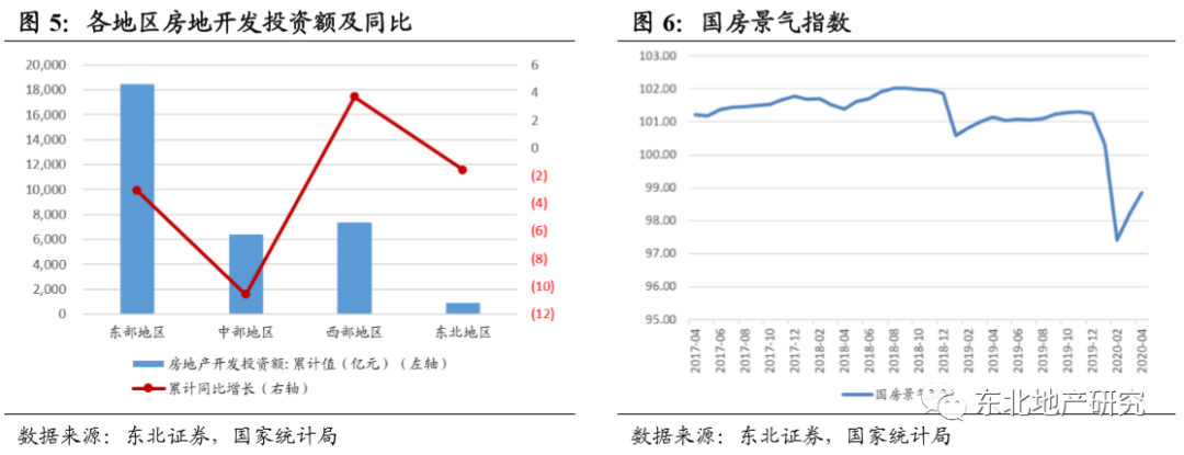 随着卫生事件影响的持续减退和复产复工的推进,房地产行业各项指标继续迎来改善。2020年1-4月,全国房地产开发投资额3.31万亿元,同比减少-3.3%,降幅较1-3月收窄4.4个百分点;1-4月,房地产开发企业房屋新开工面积47768万平米,同比下降18.4%,降幅收窄8.8个百分比;其中住宅新开工面积35248万平米,同比下降18.7%;同期房屋竣工面积19286万平米,同比减少14.5%,降幅收窄1.3个百分点;4月单月新开工19565万平米,同比下降1.31%,降幅大幅收窄9.14个百分点。我们预计后续新开工面积增速将持续回暖。4月,房地产开发景气指数为98.86,较2020年3月底提升0.67