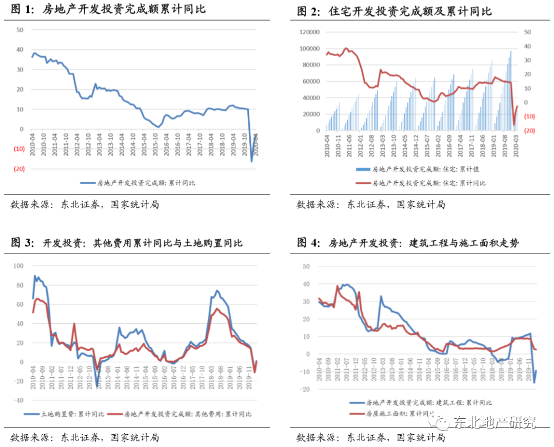 2020年1-4月,全国房地产开发投资完成额33103亿元,同比减少-3.3%,降幅较1-3月收窄4.4个百分点;同期住宅开发投资完成额为24238亿元,同比减少-2.8%,降幅收窄4.4个百分点,但对整体开发投资完成额继续起拉动作用,占比73.2%。此外,从前3月数据来看,土地购置对房地产开发投资完成额起带动作用,助力开发投资完成额跌幅收窄。