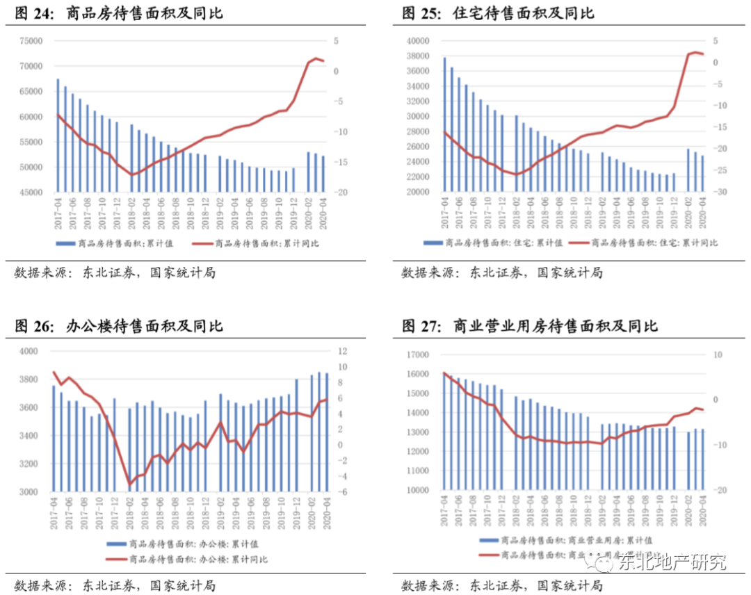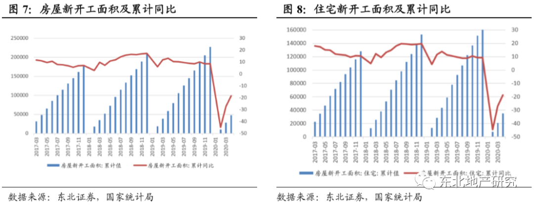 2020年1-4月,房地产开发企业房屋新开工面积47768万平米,同比下降18.4%,降幅收窄8.8个百分比;其中住宅新开工面积35248万平米,同比下降18.7%。