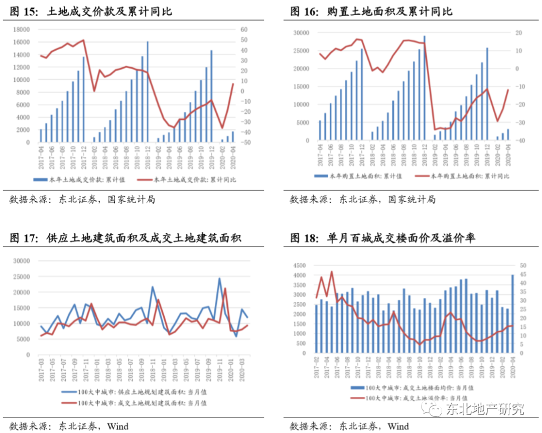 2020年1-4月,房地产开发企业土地购置面积3151万平米,同比降低12.0%,降幅环比收窄10.6个百分点;土地成交价款1669亿元,同比增长6.9%,1-3月份为下降18.1%,实现年内首次增速由负转正。
