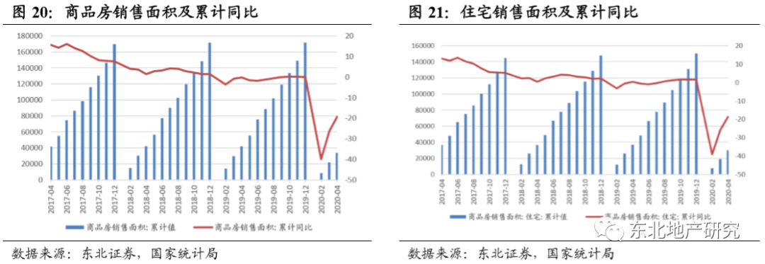 销售回暖,小阳春延后触发。2020年1-4月商品房销售面积33973万平米,同比减少19.3%,降幅环比收窄7.0个百分点;其中商品住宅销售面积为29916万平米,同比减少18.7%,降幅收窄7.2个百分点;商品房销售额31863亿元,同比减少18.6%,降幅环比收窄6.1分点。1-4月累计销售均价为9376元/平米,较去年同比增长76元/平米;4月单月住宅销售均价为9586元/平米,环比上月上升580元/平米,同比下降288元/平米,价格上涨得到了很好的控制。小阳春如我们预期滞后在4、5月体现。