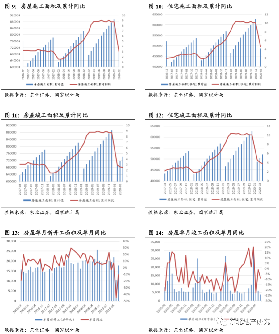 随着卫生事件影响的消退、复工复产的有序推进,新开工、竣工指标逐步回暖,4月单月新开工19565万平米,同比下降1.31%,降幅大幅收窄9.14个百分点。我们预计后续新开工面积增速将持续回暖。