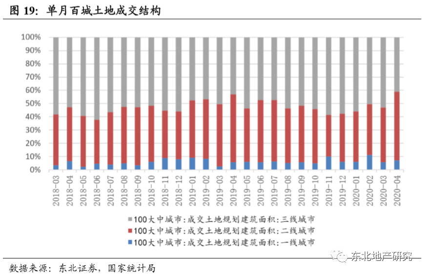 百城土地供应成交数据来看,4月单月供应11924万平米,成交9275万平米,成交楼面均价4010元/平米,百城土地成交溢价率为15.46%,连续两个月保持15%以上,土地市场较年初有明显回暖。4月百城土地成交中一线、二线、三线成交分别成交682、4795、3798万平米。成交面积结构中一线、二线、三线城市土地成交面积占比分别占比7.35%、51.70%、40.95%,二线城市土地成交占比有较3月提升约10个百分点,为2019年下半年以来首次超50%。