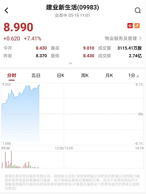 智通财经APP获悉,建业新生活(09983)上市次日,盘中放量上扬,一度高见9.05港元,较发售价6.85港元高逾32%。截至11时01分,涨7.41%,报价8.99港元,成交额2.74亿。