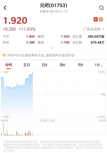 智通财经APP获悉,兑吧(01753)发布公告,该集团的用户运营SaaS业务于截至2020年3月31日止3个月的新签约(含续约)合约数量为156份(2019年同期为125份),新签合约(含续约)总额为人民币1890万元(2019年同期为人民币650万元),同比增长1.9倍。截至发稿,兑吧涨11.05%,报1.91港元,成交额672.93万港元。