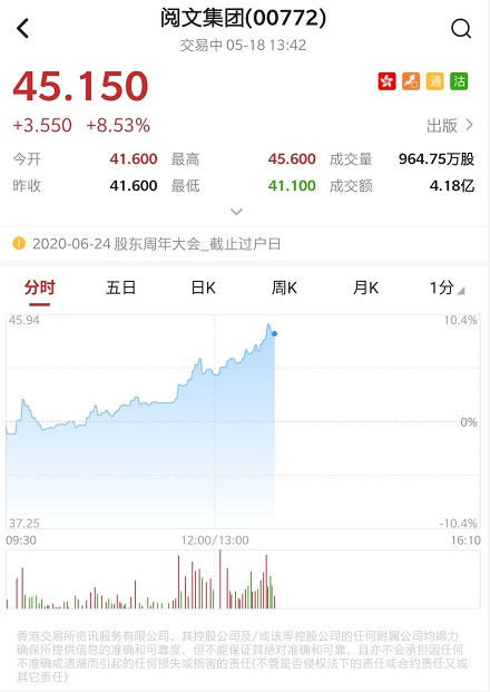 智通财经APP获悉,腾讯(00700)总裁刘炽平此前表示,腾讯团队接手阅文(00772)后,会继续驱动阅文的核心价值,未来也会尝试免费阅读模式,以达到平台作家及消费者的双赢。腾讯团队接手至今,阅文股价累计涨幅超50%。截至发稿,阅文涨8.53%,报45.15港元,成交额4.15亿港元。