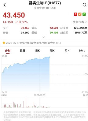 智通财经APP获悉,生物医药股持续获市场热炒,君实生物-B(01877)午后涨幅扩大逾10%,盘中以43.5港元刷新历史新高。截至13时38分,涨10.56%,报价43.45港元,成交额5045.7万。