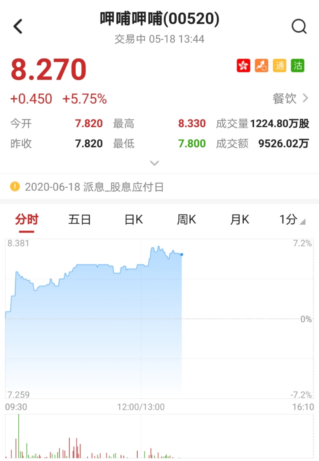 智通财经APP获悉,麦格理发布研报称,呷哺呷哺(00520)透露至上月底已有逾900家分店恢复营业,收入正逐步恢复,各地区复苏步伐有所不同。该股盘中涨近6%,突破多条均线,创近两个月新高。截至13时44分,涨5.75%,报价8.27港元,成交额9526.02万。