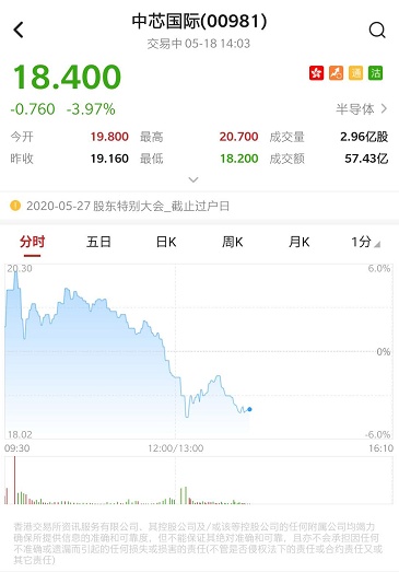 智通财经APP获悉,午间市场传闻称,台积电(TSM.US)已停止接收华为新订单。台积电方面回应,称已停止向华为提供新订单的报道“纯粹是市场传言”。中芯国际(00981)早盘曾涨超7%,午后转跌逾4%。截至发稿,跌4.07%,报18.38港元,成交额57.41亿港元。