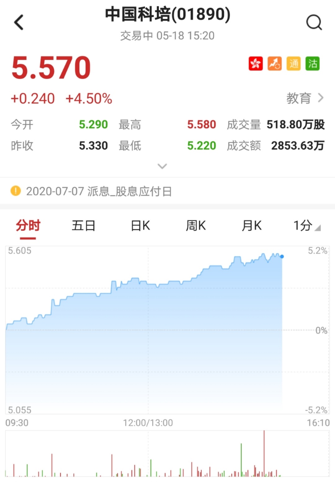 智通财经APP获悉,中国科培(01890)近日公布,公司将获纳入MSCI中国全股票小型股指数成分股,于2020年5月29日收市起生效。该股涨近5%,突破所有均线,刷新历史新高。截至15时20分,涨4.5%,报价5.57港元,成交额2853.63万。