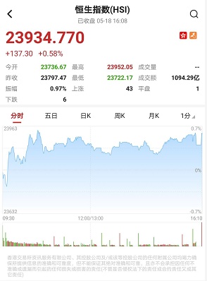 智通财经APP获悉,恒指早盘低开60.8点或0.26%,报23736.67点。截至收盘,恒生指数涨137.3点或0.58%,报23934.77点,全日成交额达1094.29亿。国企指数涨0.54%,报9726.43点,红筹指数涨0.78%,报3761.08点。