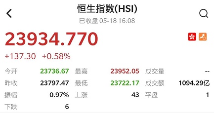 智通财经APP获悉,恒生指数开盘跌0.26%,全天震荡走高。截至收盘,恒生指数涨137.3点或0.58%,报23934.77点,全日成交额达1094.29亿。国企指数涨0.54%,报9726.43点,红筹指数涨0.78%,报3761.08点。