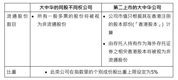 在超过90%回复人士的大幅度支持下,来自大中华区域(即香港、内地、澳门及台湾)的同股不同权公司以及第二上市公司,将被纳入至恒生指数及恒生中国企业指数的选股范畴。由于亦有回复人士倾向限制此等公司在恒生指数及恒生中国企业指数中的比例,以下措施将会同步实施。