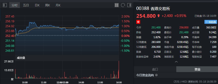 截至今日收盘,港交所涨0.95%,报254.80港元。