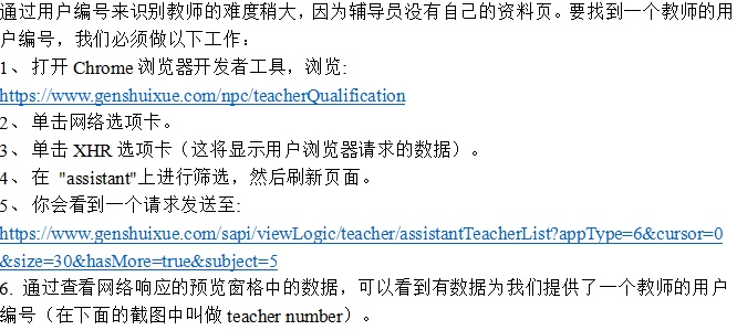 这个平台既有网站,也有学生可以使用的桌面应用。我们并没有分析这个平台上的任何移动应用,因为它不需要。用户注册并登录后,打开Chrome浏览器的开发者工具,打开网络选项卡,切换到XHR,就可以看到浏览器和跟谁学网站之间的数据传递。在这些数据中,有大量的信息,包括用户所购买的每一节课的存档,这也是我们在这两个平台上进行机器人活动分析时使用的数据。