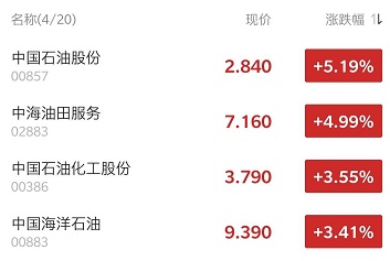 截至发稿,中海油服(02883)涨5.28%,报7.18港元;中石油(00883)涨4.81%,报2.83港元;中石化(00386)涨3.83%,报3.8港元;中海油(00883)涨3.52%,报9.4港元。