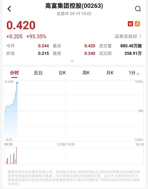 截至10时02分,涨95.35%,报价0.42港元,成交额258.91万。