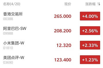 截至发稿,港交所(00388)涨4%,报265港元;阿里巴巴-SW涨2.56%,报208.2港元;小米集团-W涨2.33%,报12.32港元;美团点评-W涨1.23%,报123.4港元。