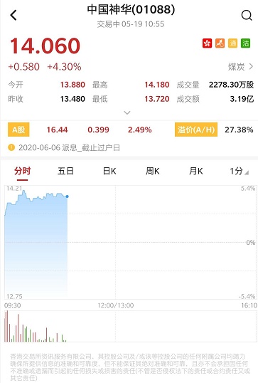 智通财经APP获悉,中国神华(01088)公告称,首四月商品煤产量9660万吨,同比增长1.3%;煤炭销售量1.299亿吨,同比增长4.9%。4月份商品煤产量2220万吨,同比减少7.1%;煤炭销售量3150万吨,同比增长68.4%。截至发稿,中国神华涨4.3%,报14.06港元,成交额3.22亿港元。