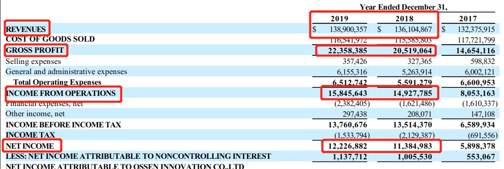 2019年奥盛创新全年营收为1.39亿美元,较2018年同期的1.36亿美元上涨2.2%; 毛利由2018年的2051.9万美元上涨到2235.8万美元,同比增长8.9%; 营业收入由2018年的1492.8万美元,上涨到1584.6万美元,同比上涨6.1%;净利润由2018年的1138.5万美元上涨到2019年的1222.7万美元,同比上涨7.3%。