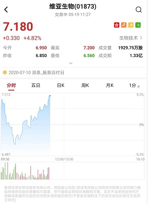 智通财经APP获悉,维亚生物(01873)盘中一度涨近5%,高见7.2港元再度刷新历史新高,截至11时27分,涨4.82%,报价7.18港元,成交额1.33亿。
