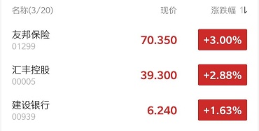 截至发稿,汇控涨3.01%,报3.95港元;友邦保险涨3%,报70.35港元;建行涨1.79%,报6.25港元。