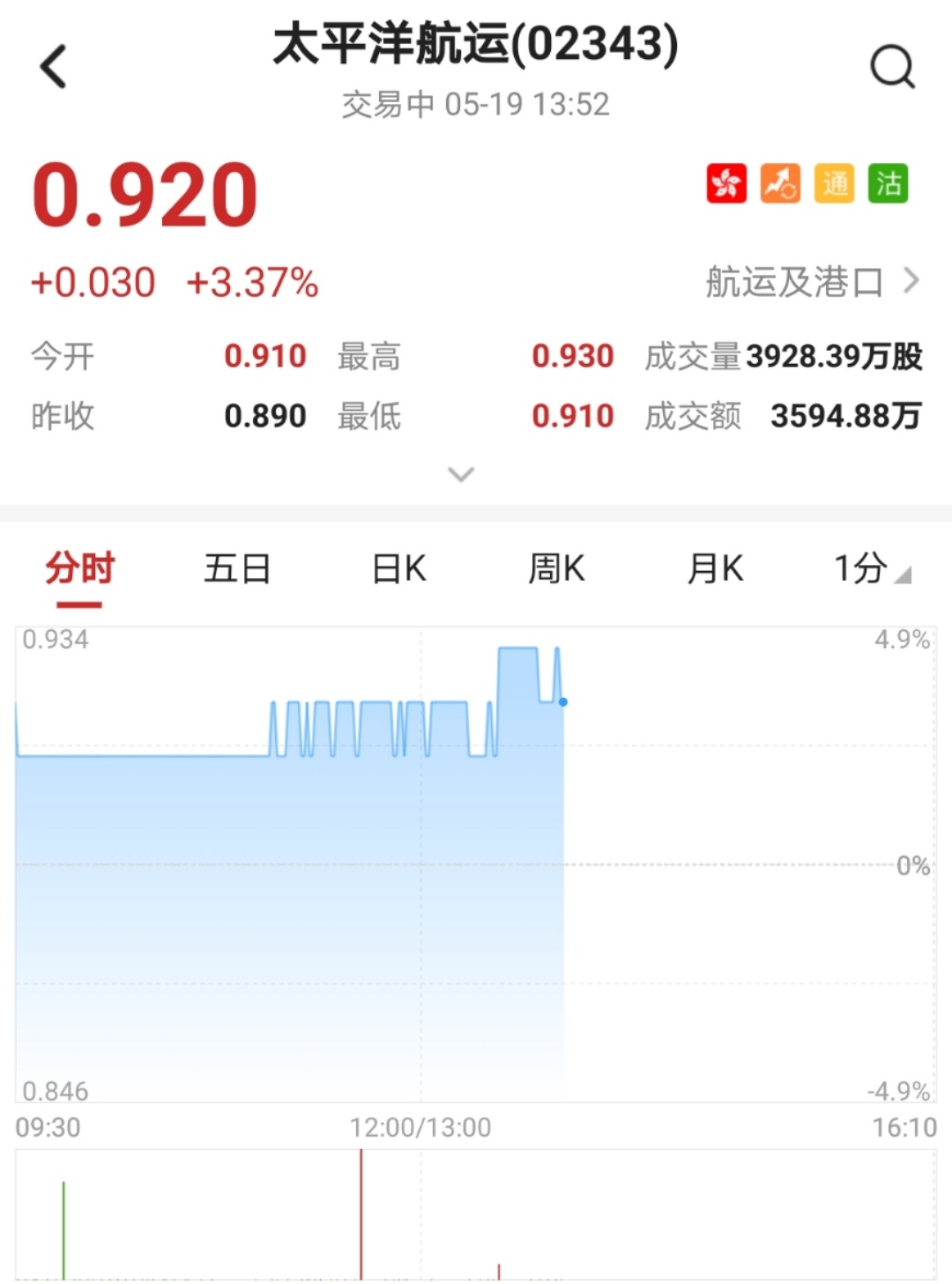 智通财经APP获悉,据港交所权益资料显示,太平洋航运(02343)获FIL Limited于5月7日以每股均价0.9547港元增持1546.9万股,涉资约达1476.83万港元。该股涨超4%,突破多条均线。截至13时52分,涨3.37%,报价0.92港元,成交额3594.88万。