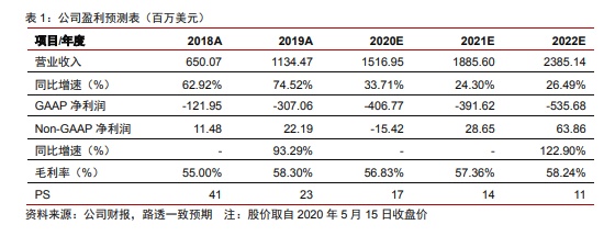 投资建议:当前公司估值对应2020年P/S为17X,显著高于美股SaaS行业平均水平8~9X,反映市场对公司较好成长性、突出产品竞争力、良好市场前景等的认可。中短期来看,公司营收增速、用户规模拓展等预计仍将是影响公司股价表现的最核心变量,同时利润率指标的改善有助于估值水平的进一步提升。