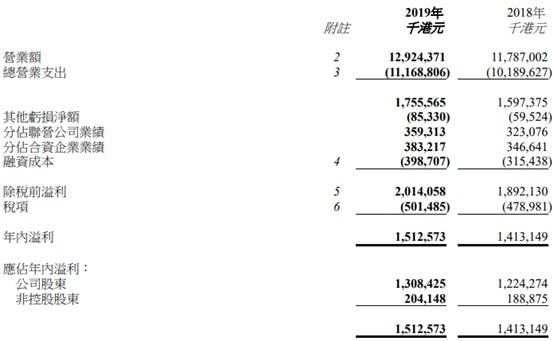 不过公司其他亏损净额同比大幅增长43.4%至8533万元,再加上因收购及成立新项目及业务发展而新增贷款,2019年融资成本达到了3.99亿港元,相比2018年增幅达到26%。因此拖累税前利润仅录得6.4%小幅增长至20.14亿元,扣税后净利润同比增长7%至15.13亿元,净利率由去年同期的12%降至11.7%。