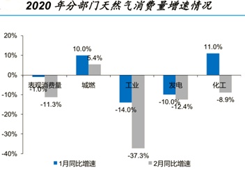 外围环境不佳情况下的行业数据出炉,市场悲观预期仍在。智通财经APP了解到,目前压制天然气行业预期的,主要是国际贸易问题和公共卫生时间等外部因素加剧经济下行压力,用能需求衰减;同时“煤改气”进度放缓,政策侧重点更多倾斜向产销储运的供应能力建设。3月31日,国家发改委发布2020年1-2月份天然气运行简况表示,1-2月份天然气产量309亿立方米,同比增长6.1%;天然气进口量224亿立方米,同比下降4.4%;天然气表观消费量527亿立方米,同比增长1%。不过由于不包含储气库等原因,发改委披露的表观消费量口径与实际值是存在差异,如参考重庆石油天然气交易中心数据,1、2月消费量增速分别为-1.0%、-11.3%,合计增速约-5.7%,城燃、工业、发电、化工用气量累计增速分别约8%、-25%、-11%、1%,其中工业、发电受停工停产影响降幅明显,机构测算数据显示1-2月实际消费量为同比负增长,降幅约在6%-10%区间内,国内天然气消费增速相比去年同期的13.5%有着大幅下降,这也意味着国内大部分城燃公司一季报业绩都受到不同程度的影响,港华燃气预计2020年1月份至2月份期间公司售气量可能会同比下降15%。