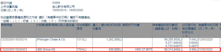 智通财经APP获悉,联交所最新资料显示,5月12日,瑞银减持金山软件(03888)40.9万股,每股作价27.8675港元,总金额约为1139.78万港元。减持后最新持股数目约为6831.49万股,最新持股比例为4.98%。