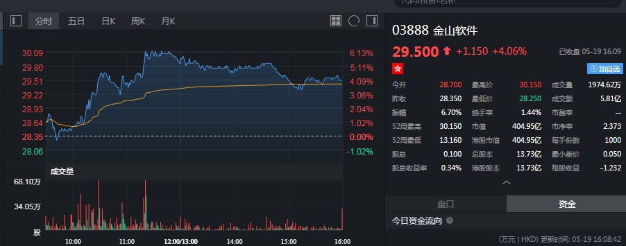 截至今日收盘,金山软件涨4.06%,报29.50港元。