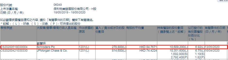 智通财经APP获悉,联交所最新资料显示,5月13日,Schroders Plc减持保利物业(06049)27.88万股,每股作价84.7671港元,总金额约为2363.31万港元。减持后最新持股数目约为1060.92万股,最新持股比例为6.92%。