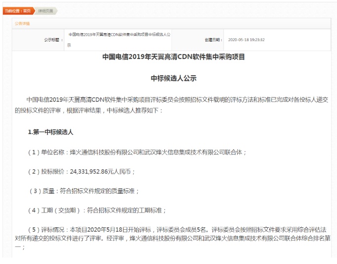 智通财经APP获悉,日前,中国电信(00728)2019年天翼高清CDN软件集中采购项目评审结果公布,该项目共有三个中标候选人。