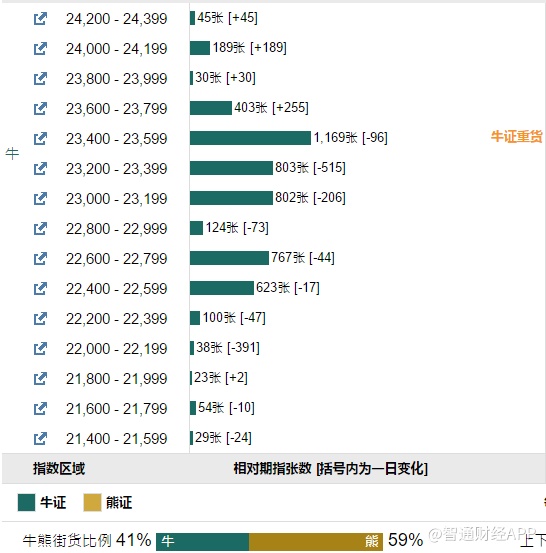 智通财经APP获悉,截至5月19日,恒指最新的牛熊街货比例41:59。摩根恒指牛熊证街货分布图中的数据显示,熊证街货重货区在24900-25099区间,该区间最新熊证数量为1851张,较上一交易日增加274张,最多新增也在该区间。牛证街货重货区在23400-23599区间,该区间最新牛证数量为1169张,较上一交易日减少96张,最多新增区间在23600-23799区间,该区间最新熊证数量为403张,较上一交易日增加255张。