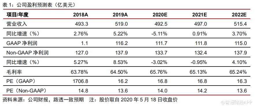 业绩概况:业绩好于市场悲观预期,利润率创历史新高。2020财年Q3公司实现营业收入120亿美元(-7.5%),比市场悲观预期高2.4%,Non-GAAP净利润为34亿美元(-2.5%)。当季公司毛利率为66.6%(+2.0pcts),Non-GAAP营业利润率为34.9%(+2.7pcts),均达到历史最高水平,公司将其归因于生产效率的提升、DRAM价格下滑带来的成本节约及服务业务占比提高。截至本报告期末,公司的货币资金及短期投资总额为286亿美元,当季向股东返还近25亿美元,包括10亿美元的股票回购以及15亿美元的分红,而公司亦计划后续每年返还50%以上的自由现金流,进行积极股东回报。公司预计2020财年Q4的收入在119-123亿美元(同比下降8.5%-11.5%),毛利率为64%-65%,Non-GAAP营业利润率为31.5%-32.5%。