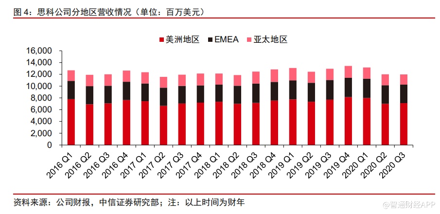 订单情况:及商业订单下滑明显,美洲及EMEA地区Q4将承压。2020Q3公司总订单下降5%,分客户来看,公共部门订单增长1%,企业客户订单下降4%,服务提供商订单下降3%,而规模较小的商业客户订单则下降11%,这主要由于中小企业应对宏观经济不确定性的能力相对较弱;分行业来看,餐饮、酒旅、零售等行业的订单下滑较为明显,而政府部门、金融、医疗行业的订单则有所增加;分地理区域来看,美洲地区订单未出现显著下滑,EMEA地区订单下降4%,而亚太地区订单则下降22%,根据公共卫生事件扩散情况,亚太地区先于欧美地区受到影响并调整资本开支,而目前欧美地区的公共卫生事件仍然较为严重,故FY2020Q4订单数仍不容乐观。