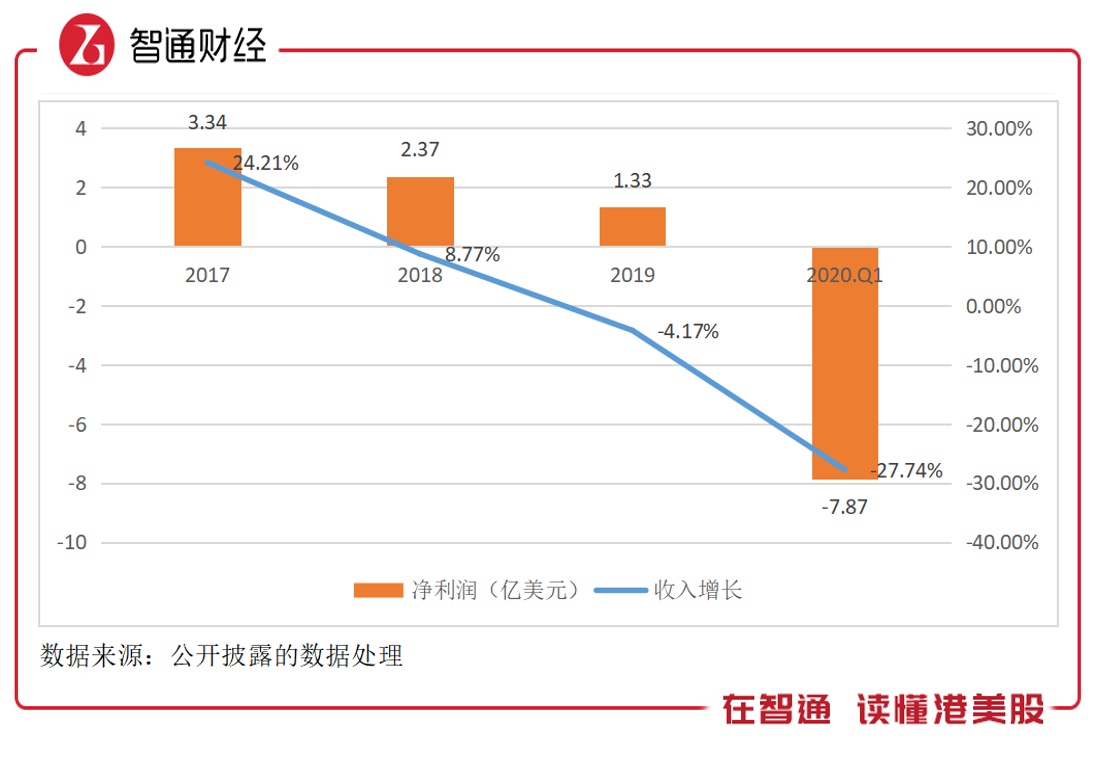 2018年5月,该公司被沽空机构沽空,自此后业绩开始持续下滑,收入增速放缓,2019年开始负增长,2019年净利润为1.33亿美元,较2017年下滑了66.2%,2020年Q1净利润亏损7.87亿美元,调整后的净利润亏损0.43亿美元。