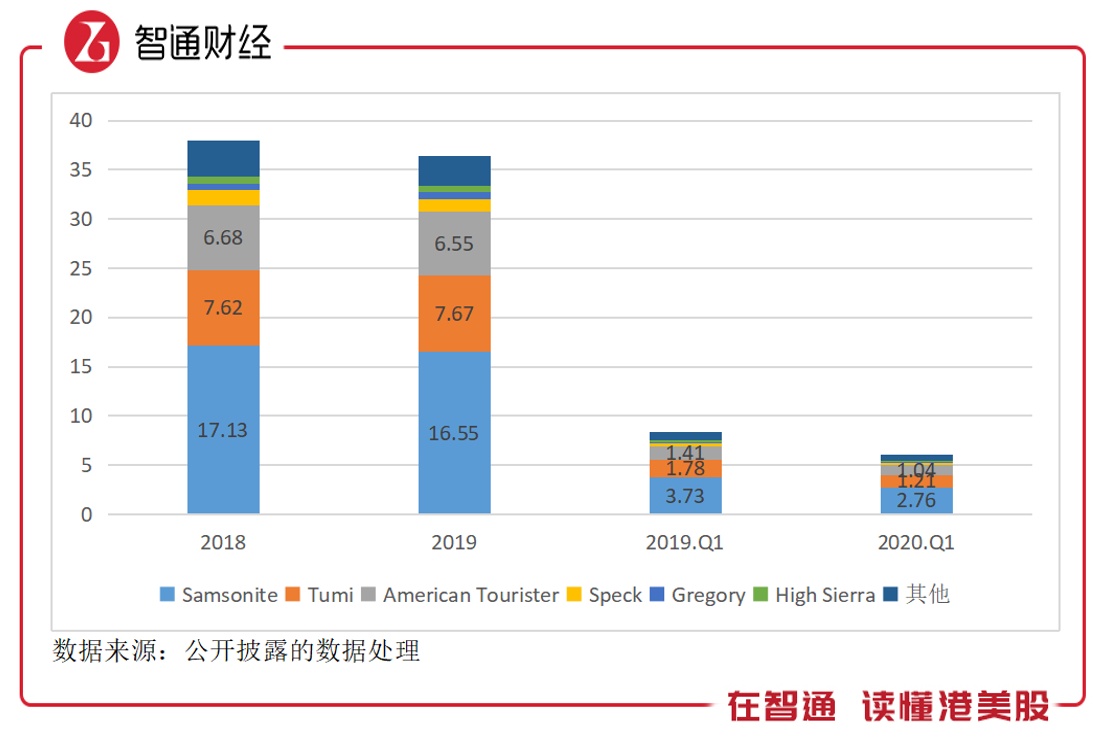 该公司的核心收入主要来源于三大品牌,分别是Samsonite、Tumi以及American Tourister品牌,从往年看,这三大品牌收入贡献“异常”稳定,Samsonite收入份额稳定在45%左右,Tumi稳定在20%左右,而American Tourister稳定在17%左右。三大品牌收入贡献往年均超过八成,2020年Q1为83.4%。