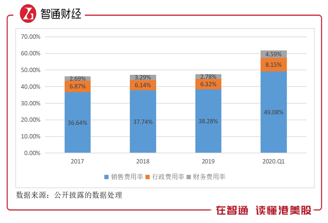 该公司的盈利水平萎缩主要受核心费用销售费用的影响,2020年Q1,销售费用率为49.08%,和毛利率仅差5.66个百分点,且较2017年年度增加了12.44%。另外其他两项费用,行政费用率及财务费用率整体都有增加的趋势,Q1期间合计我12.74%,较2017年度增加3.15个百分点。