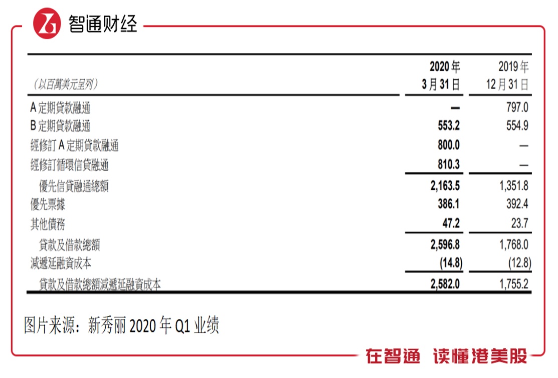 实际上,资金增加主要为该公司期间通过融资获得现金流,2020年3月16日,通过定期贷款融资获得8亿美元资金,20日又通过循环信贷融通获得8.1亿没有的资金,目前的贷款及借款总额超过25亿美元,占比总资产达48.6%,但这部分资金主要为长期借款。