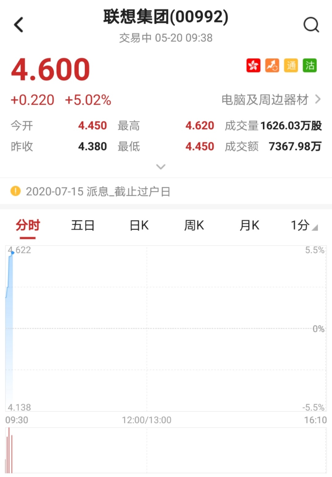 该股早盘涨超5%,突破多条均线,创一个月新高。截至9时38分,涨5.02%,报价4.6港元,成交额7367.98万。