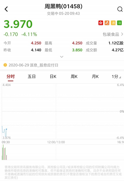 智通财经APP获悉,周黑鸭(01458)市前现两宗大手成交,涉及1.02亿股,每股均价3.8港元,涉资3.88亿港元。周黑鸭盘初急跌逾6%,截止发稿,跌4.35%,报3.96港元,成交额4.26亿港元。