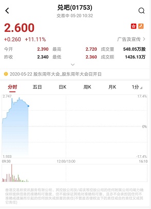 智通财经APP获悉,兑吧(01753)延续涨势,早盘一度涨超15%,创逾1个月新高,四日累涨逾60%。截至10时32分,涨11.11%,报价2.6港元,成交额1426.13万。