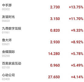 智通财经APP获悉,伽马数据近期发布4月移动游戏报告,手游股早盘全线上扬。截至10时52分,中手游(00302)涨13.75%,创一个月新高,友谊时光(06820)涨11.7%,创历史新高,心动公司(02400)涨4.14%,创两个月新高。